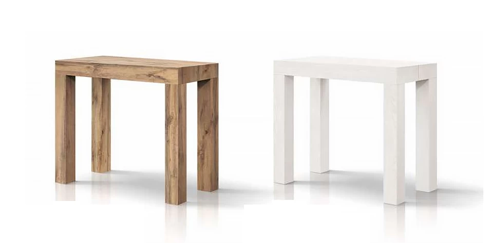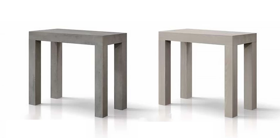 Έξυπνη κονσόλα- επεκτεινόμενο τραπέζι, σε μίνιμαλ στυλ, είναι η ιδανική λύση για όσους χρειάζονται ένα μεγάλο τραπέζι αλλά δεν έχουν χώρο. Μεταμορφώνεται μόλις σε λίγα λεπτά, με 5 προεκτάσεις των 51 cm η κάθε μία και μπορεί να φιλοξενήσει έως και 14 άτομα. Αυτή η κονσόλα είναι πρακτική στο άνοιγμα και στο κλείσιμο, χάρη στην τηλεσκοπικό μηχανισμό της. Διαθέτει επίσης δύο επιπλέον πόδια, για την στήριξη των προσθηκών. Η κονσόλα έχει επένδυση μελαμίνης και παρουσιάζεται σε εφέ δρυός, αλλά διατίθεται επίσης και σε άλλα τρία χρώματα.