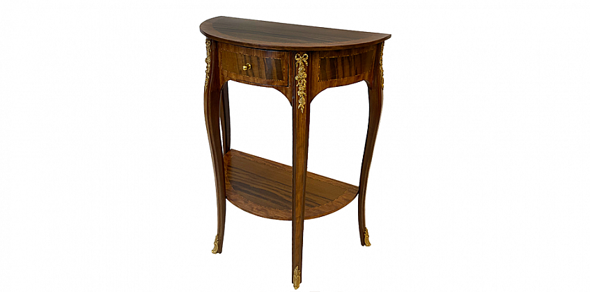 Κονσόλα ημικυκλική με εταζέρα και ένα συρτάρι. Τα έπιπλα Louis XVI και Louis XV είναι από τα πιο δημοφιλή και τα πιο αντιπροσωπευτικά των κλασικών επίπλων, ειδικά στα μοντέρνα σπίτια. Η κονσόλα παρουσιάζεται με ένθετο χειροποίητο μαρκετερί και είναι κατασκευασμένη από ξύλο οξιάς. Το έπιπλο αναδεικνύει την ατέλεια του χειροποίητου, για αυτό και πολλές ενώσεις φαίνονται πολυκαιρισμένες. Η επένδυση από φυσικό καπλαμά έχει γίνει στο χέρι, ενώ οι γωνίες, τα πόδια και τα πόμολα είναι διακοσμημένα με σφυρήλατο μπρούντζο, κατατάσσοντας το έπιπλο στις αντίκες, λόγω της αισθητικής, της ιστορικής σημασίας και της κατασκευής του.