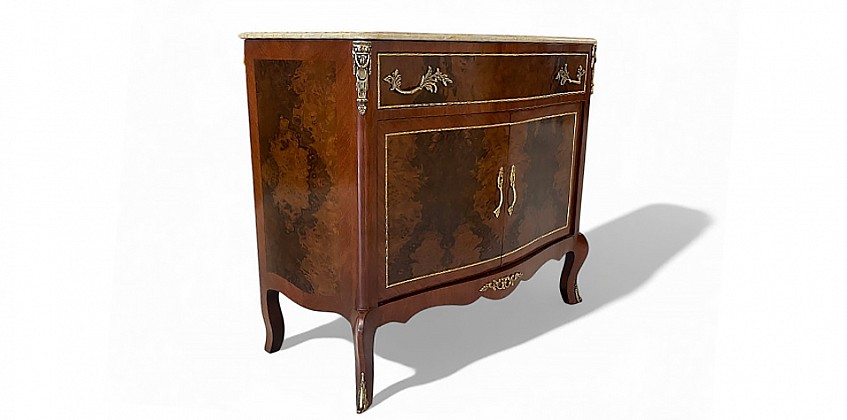 Κλασικό έπιπλο μπαγιού με ντουλάπια και ένα συρτάρι. Τα έπιπλα Louis XVI και Louis XV είναι από τα πιο δημοφιλή και τα πιο αντιπροσωπευτικά των κλασικών επίπλων, ειδικά στα μοντέρνα σπίτια. Η επένδυση σε ρίζα ελιάς από φυσικό καπλαμά έχει γίνει στο χέρι, ενώ οι γωνίες, τα πόδια και τα πόμολα είναι διακοσμημένα με σφυρήλατο μπρούντζο. Το έπιπλο αναδεικνύει την ατέλεια του χειροποίητου, για αυτό και πολλές ενώσεις φαίνονται πολυκαιρισμένες. (K5250)