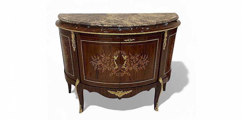 Μπαγιού ημικυκλικό με δύο πόρτες και μάρμαρο. Τα έπιπλα Louis XVI και Louis XV είναι από τα πιο δημοφιλή και τα πιο αντιπροσωπευτικά των κλασικών επίπλων, ειδικά στα μοντέρνα σπίτια. Το μπαγιού παρουσιάζεται με ένθετο χειροποίητο μαρκετερί και είναι κατασκευασμένο ξύλο οξιάς. Το έπιπλο αναδεικνύει την ατέλεια του χειροποίητου, για αυτό και πολλές ενώσεις φαίνονται πολυκαιρισμένες. Η επένδυση από φυσικό καπλαμά έχει γίνει στο χέρι, ενώ οι γωνίες, τα πόδια και τα πόμολα είναι διακοσμημένα με σφυρήλατο μπρούντζο, κατατάσσοντας το έπιπλο στις αντίκες, λόγω της αισθητικής, της ιστορικής σημασίας και της κατασκευής του.(K5700)