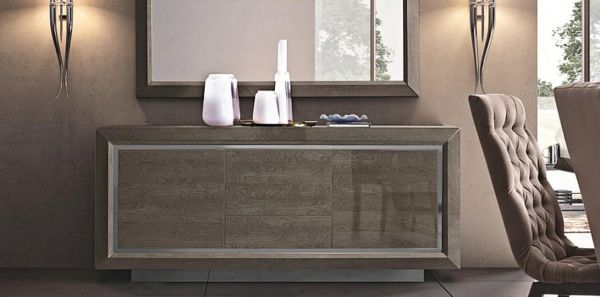 Ο μπουφές εμφανίζεται με μοντέρνα εμφάνιση, ακριβείς λεπτομέρειες και εντυπωσιακό γυαλιστερό, γκρι φινίρισμα. Τα ντουλάπια και τα συρτάρια του μπουφέ διαθέτουν μαλακό μηχανισμό κλεισίματος με φρένο και εσωτερικές λαβές σε silver φινίρισμα και τριγωνικά πόδια. Τα έπιπλα στο τελικό στάδιο έχουν περαστεί με λάκα υψηλής γυαλάδας, για τη σωστή αδιαβροχοποίηση τους.
