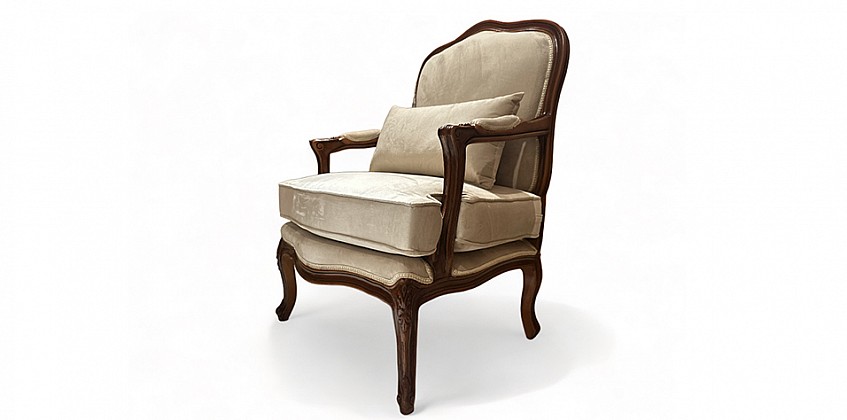 Κλασσική πολυθρόνα. (Σετ 2 τεμαχίων 760 €) Η πολυθρόνα σε κλασσική γραμμή, με την απλότητα της μονοχρωμίας και την πολυτέλεια του βελούδου, διακοσμεί όμορφα κάθε δωμάτιο. Η πολυθρόνα παρουσιάζεται με καρυδί φινίρισμα και ξυλόγλυπτο σκελετό από μασίφ, φυσικό ξύλο. Μια προφανής επιλογή για όσους αγαπούν την κλασική, διαχρονική διακόσμηση. Η πλάτη και το κάθισμα έχουν στο εσωτερικό γέμισμα από αφρώδες υλικό και επένδυση από βελούδο σε λευκή απόχρωση. (K3600)
