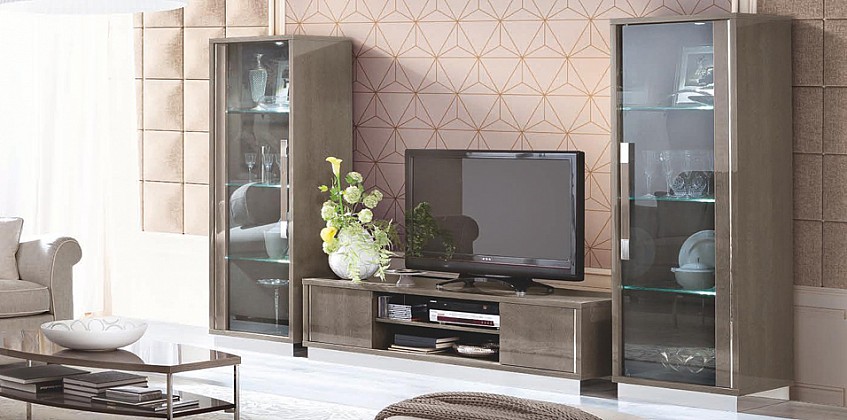 Σύνθεση σαλονιού γκρι με μοντέρνα εμφάνιση, ακριβείς λεπτομέρειες και εντυπωσιακό γυαλιστερό φινίρισμα. Η σύνθεση σαλονιού είναι Ιταλικού σχεδιασμού, μια ανθεκτική κατασκευή, σε γκρι χρώμα. Εξωτερικά έχει σφραγιστεί με ένα "film" πολυεστερικής λάκας, αποκτώντας υψηλή γυαλάδα και αντοχή στο χρόνο. Η τελική επεξεργασία με φινίρισμα λάκας υψηλής γυαλάδας, επιτυγχάνει σφράγισμα των πόρων και σωστή αδιαβροχοποίηση του επίπλου. Οι μεταλλικές λαβές με το ασημί φινίρισμα προσθέτουν κομψότητα όπως και το προφίλ από ανοξείδωτο ατσάλι. Η σύνθεση σαλονιού παρέχει ανοιχτό και κλειστό χώρο αποθήκευσης για όλα τα είδη αντικειμένων.