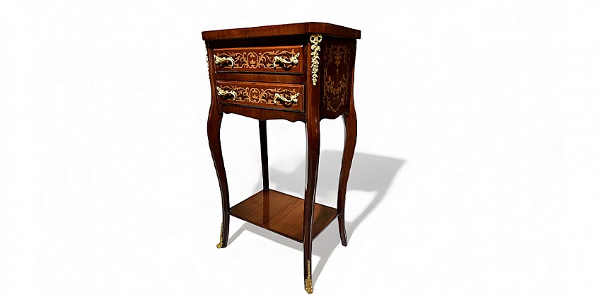 Τραπεζάκι εποχής με μαρκιτερί, εταζέρα και δύο συρτάρια. Τα έπιπλα Louis XVI και Louis XV είναι από τα πιο δημοφιλή και τα πιο αντιπροσωπευτικά των κλασικών επίπλων, ειδικά στα μοντέρνα σπίτια. Το τραπεζάκι παρουσιάζεται με ένθετο χειροποίητο μαρκετερί και είναι κατασκευασμένο σε συνδυασμό από ξύλο παλίσανδρου και ρίζα ελιάς. Το έπιπλο αναδεικνύει την ατέλεια του χειροποίητου, για αυτό και πολλές ενώσεις φαίνονται πολυκαιρισμένες. Η επένδυση από φυσικό καπλαμά έχει γίνει στο χέρι, ενώ οι γωνίες, τα πόδια και τα πόμολα είναι διακοσμημένα με σφυρήλατο μπρούντζο, κατατάσσοντας το έπιπλο στις αντίκες, λόγω της αισθητικής, της ιστορικής σημασίας και της κατασκευής του.(K1750)